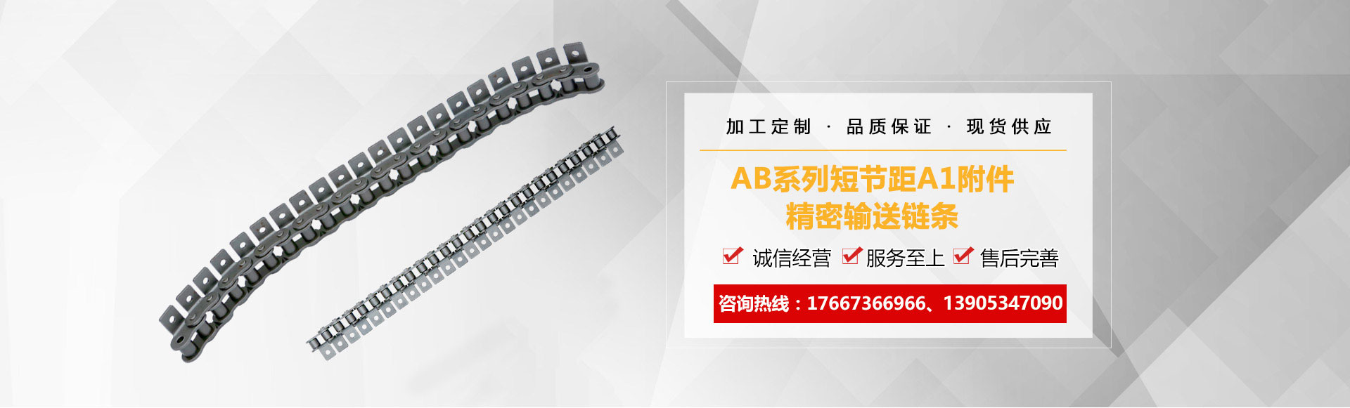 1、鏈條產(chǎn)品有各種不銹鋼、碳鋼輸送鏈條、雙節(jié)距輸送鏈條、空心銷軸鏈條、不銹鋼塑料平頂鏈、不銹鋼精密滾子鏈、特殊工礦輸送鏈、耐高溫輸送鏈條、非標鏈條、彎板非標鏈條、大節(jié)距輸送鏈條、各種鏈條用滾子(材質(zhì)碳鋼、不銹鋼)等。